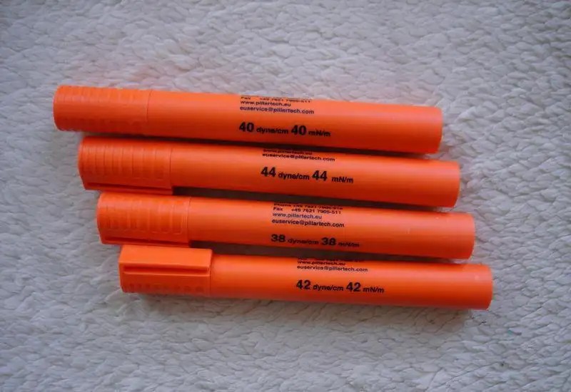 有著進一步的要求我們(men) 可以使用達因筆,也叫表麵張力筆,用來測量等離子清洗前後的達因值,簡單、直觀。它的使用方法很簡單,隻需要在處理後和處理前的材料表麵上劃一道痕跡,然後再進行觀察便行了。