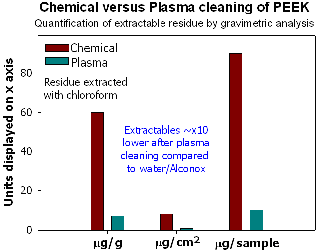 同樣地,低溫等離子體(ti) 同樣可用於(yu) 清洗機加工和去毛刺後的PEEK材料。傳(chuan) 統的濕化學處理方法在處理這種材料時,溶劑容易導致PEEK膨脹從(cong) 而汙染主體(ti) 材料,而等離子體(ti) 作為(wei) 一種幹化學的清洗技術更具有特殊的優(you) 勢。