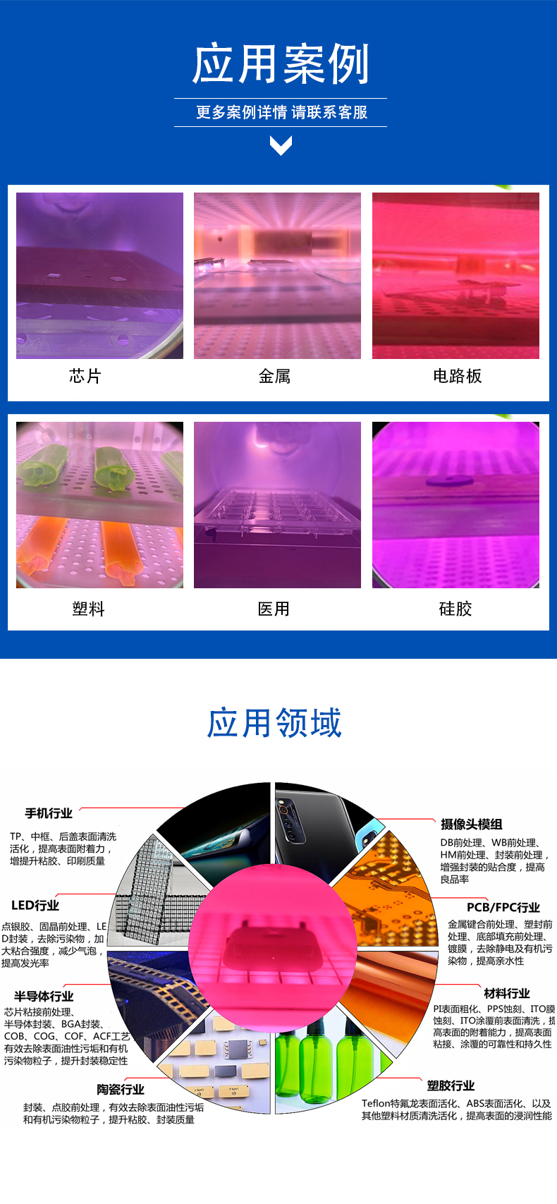 1、對電子材料、金屬材料、塑料、玻璃、橡膠、PTFE等,表麵進行清洗,活化改性,去有機物,去氧化物,去顆粒;