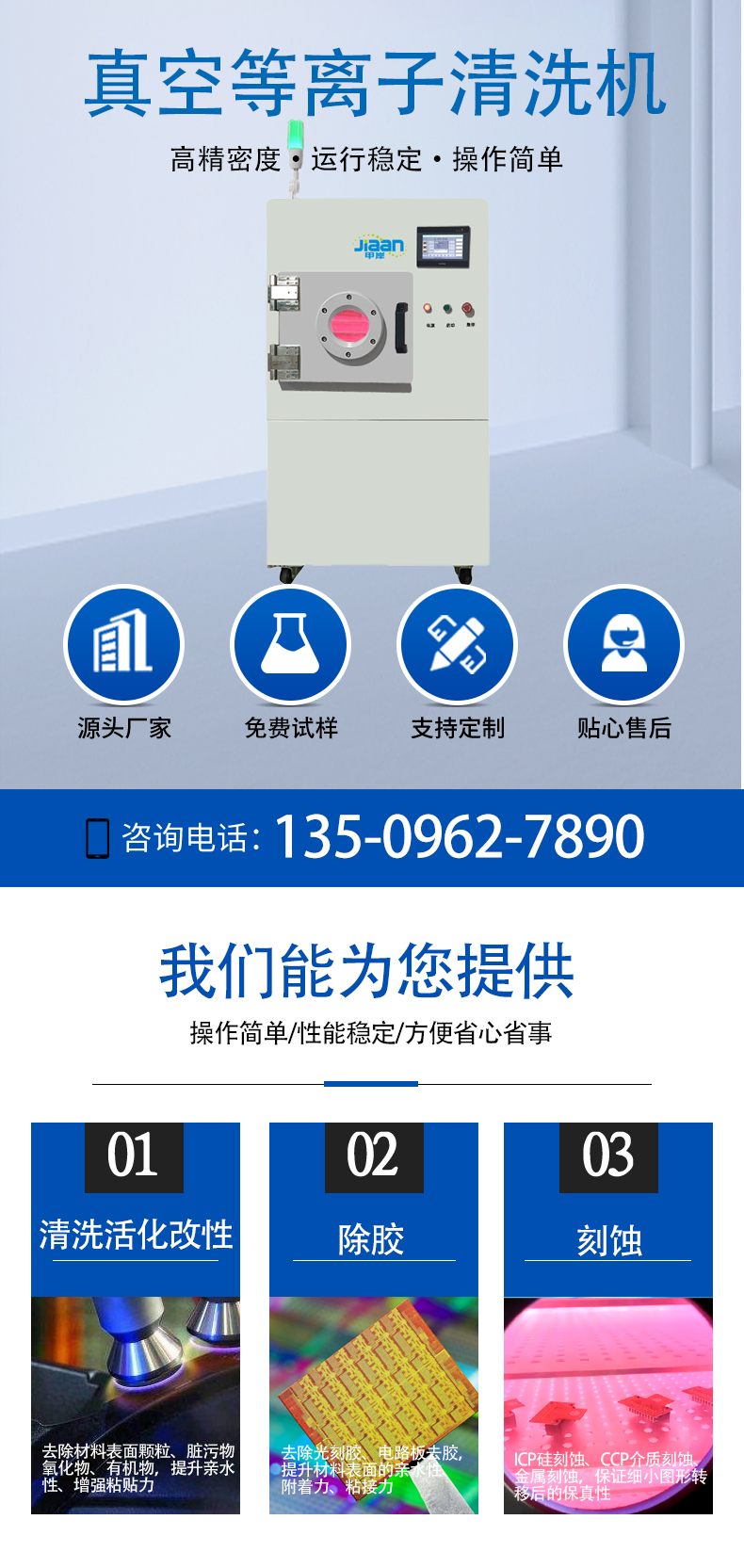 1、對電子材料、金屬材料、塑料、玻璃、橡膠、PTFE等,表麵進行清洗,活化改性,去有機物,去氧化物,去顆粒;