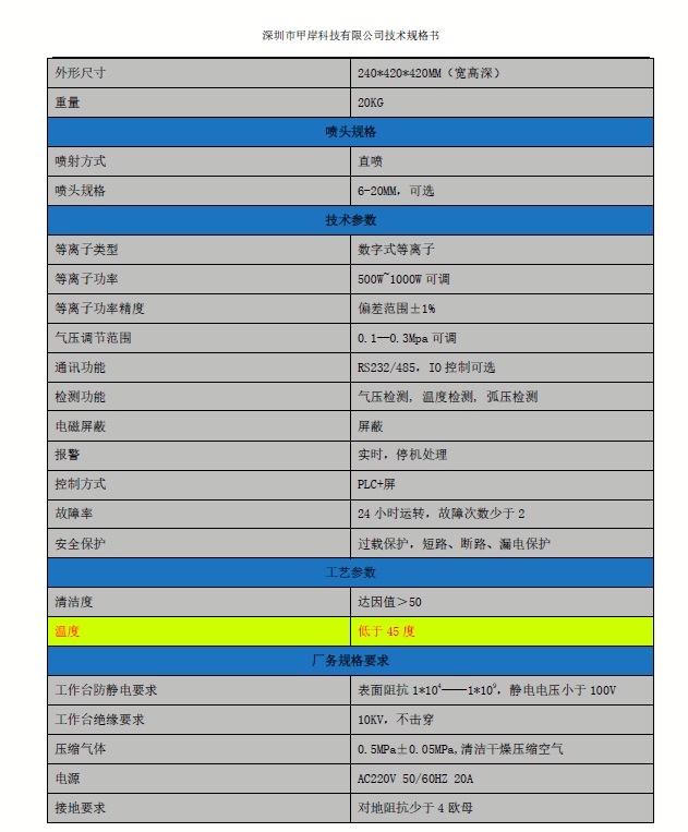 等離子體(ti) 溫度 | <45°C,最低小於(yu) 38°C |